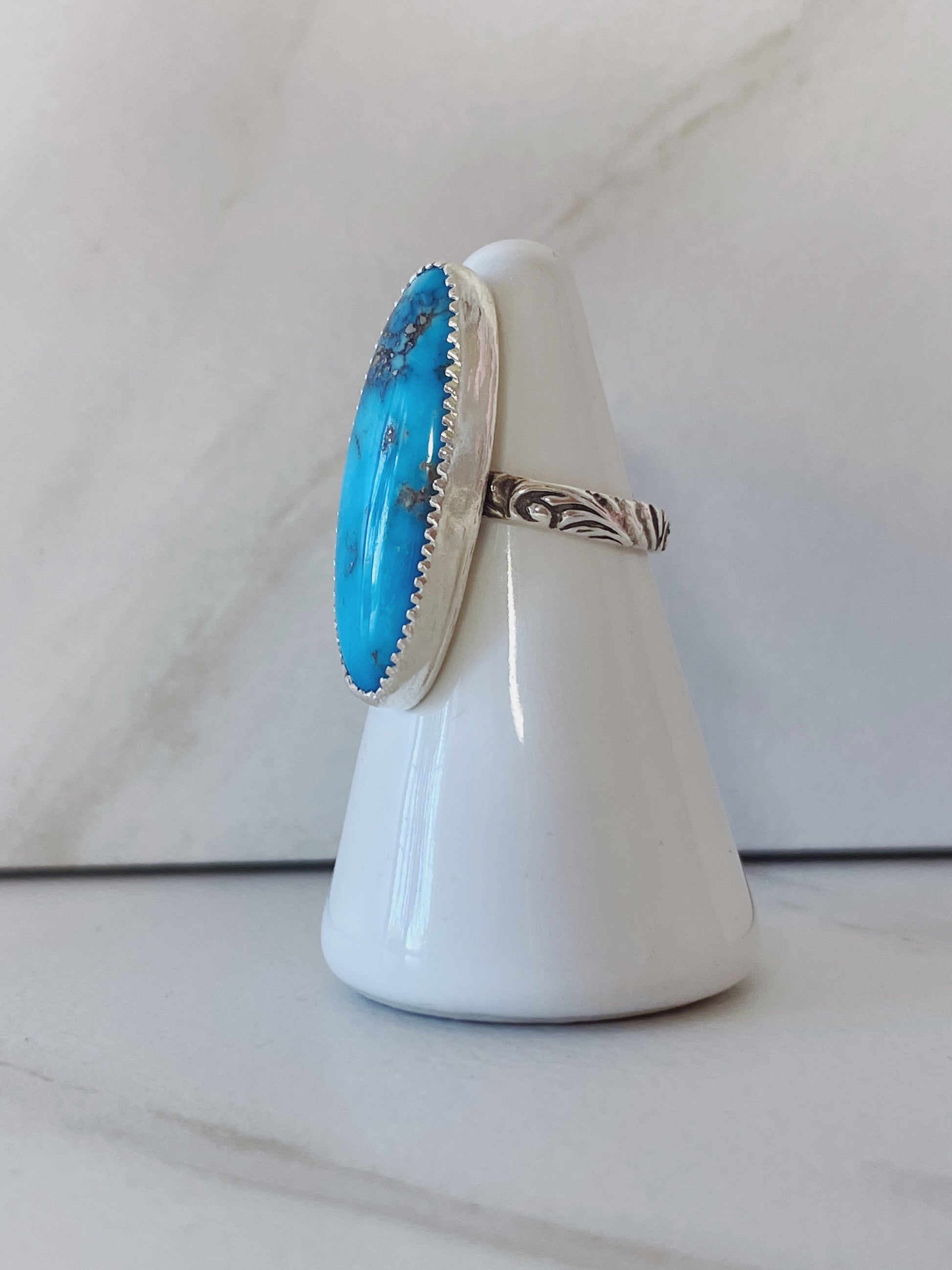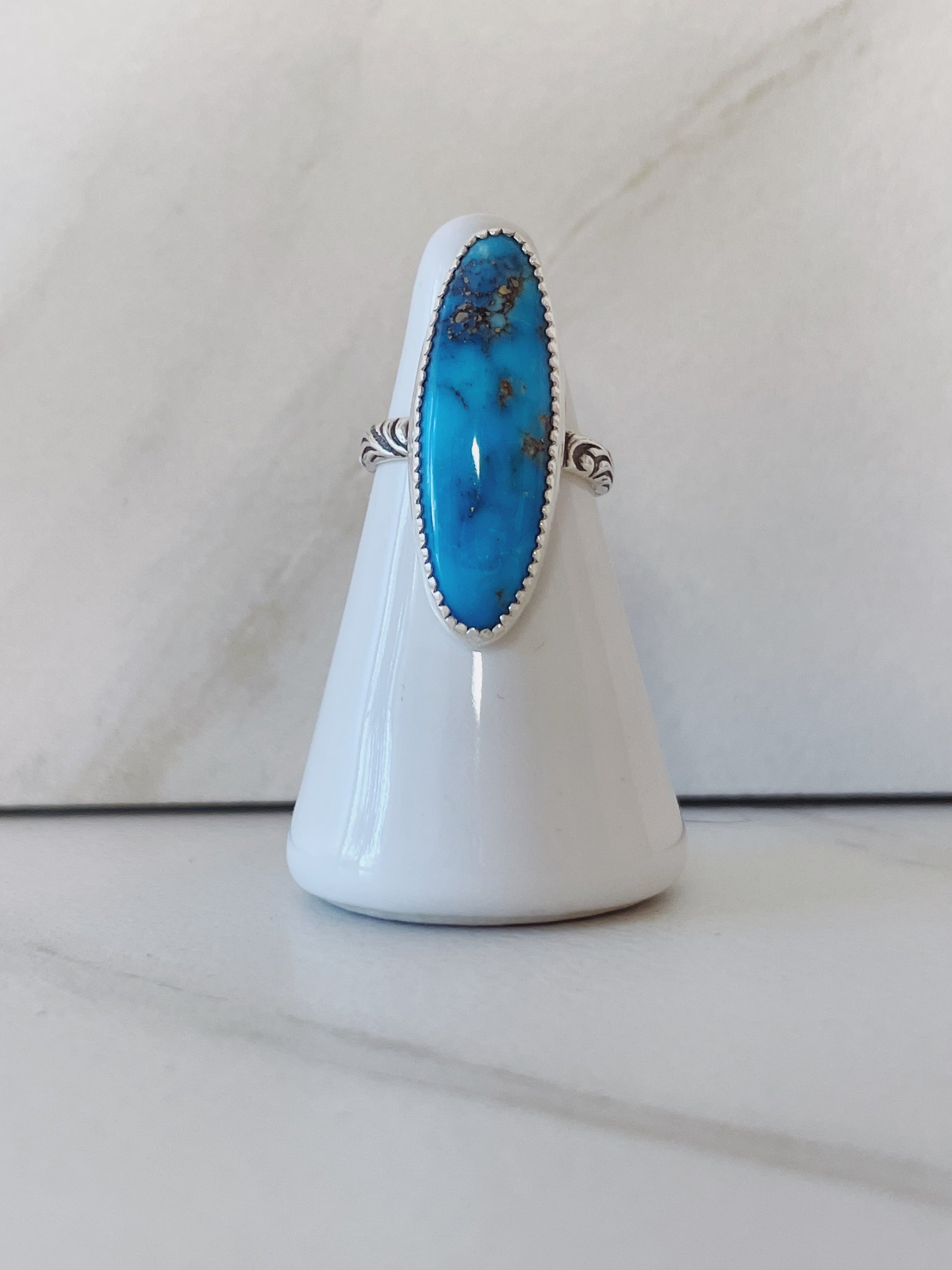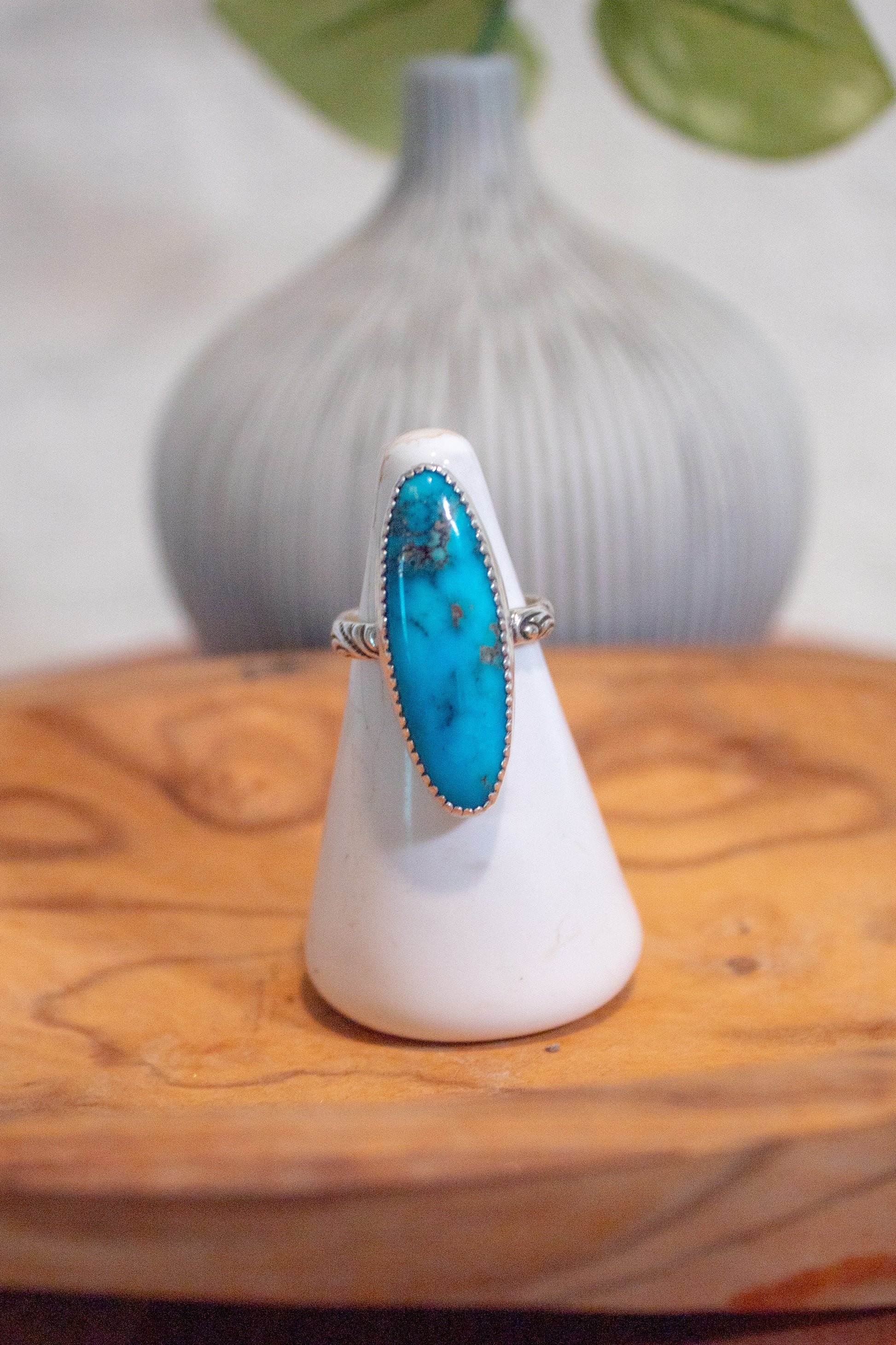 Discover elegance with this Morenci Turquoise Ring, meticulously hand-set in luminous sterling silver with a delicately embellished band. The elongated turquoise stone captivates with its rich, deep hues and natural matrix patterns—making it a stunning statement piece that blends timeless charm with southwestern flair.