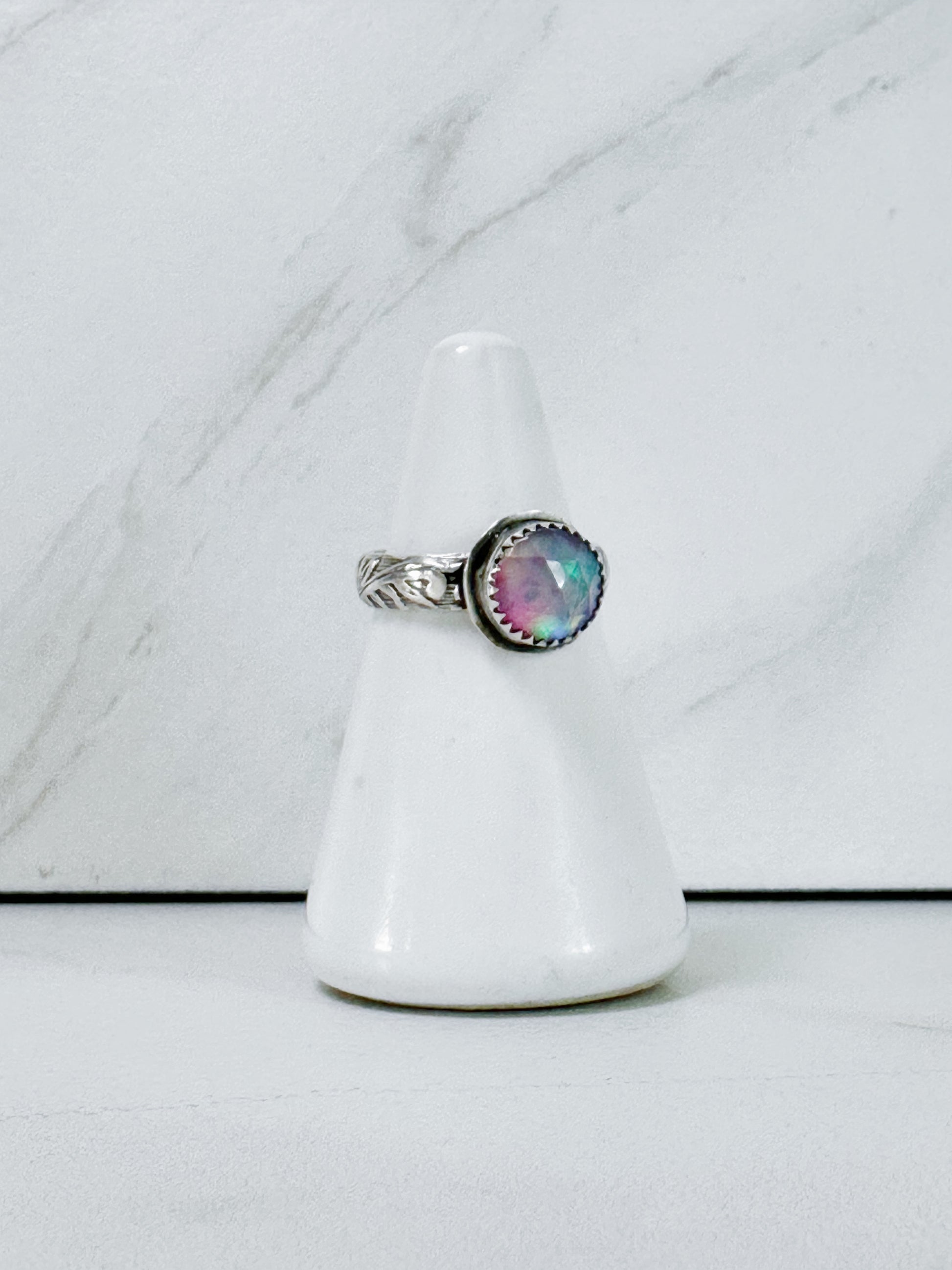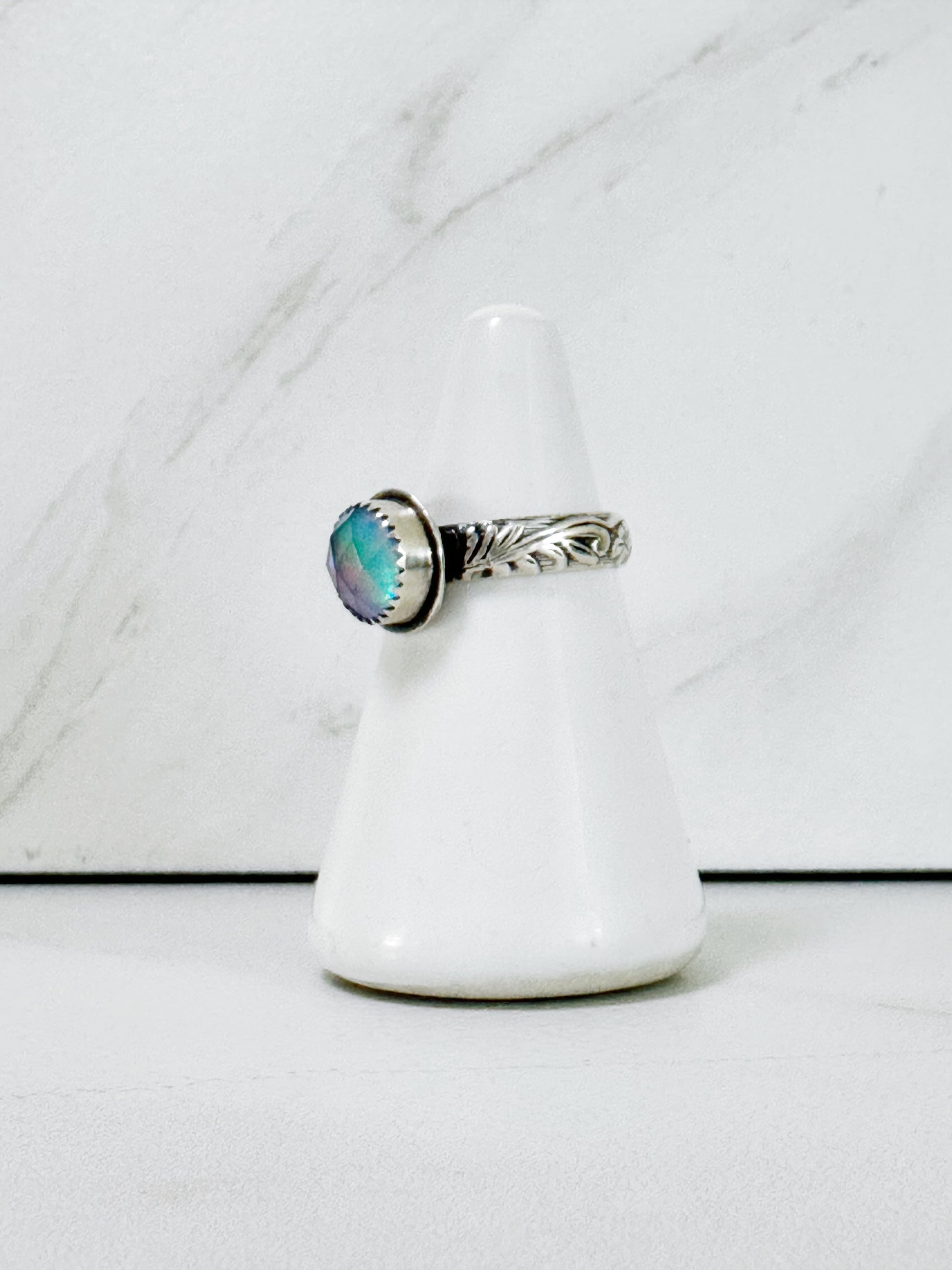 This captivating piece centers a shimmering Pink Aurora Opal—a vibrant lab-created gemstone designed to echo the playful color shifts of a natural opal. It’s set within a delicate sterling silver filigree band, balancing bold sparkle with vintage-inspired elegance.