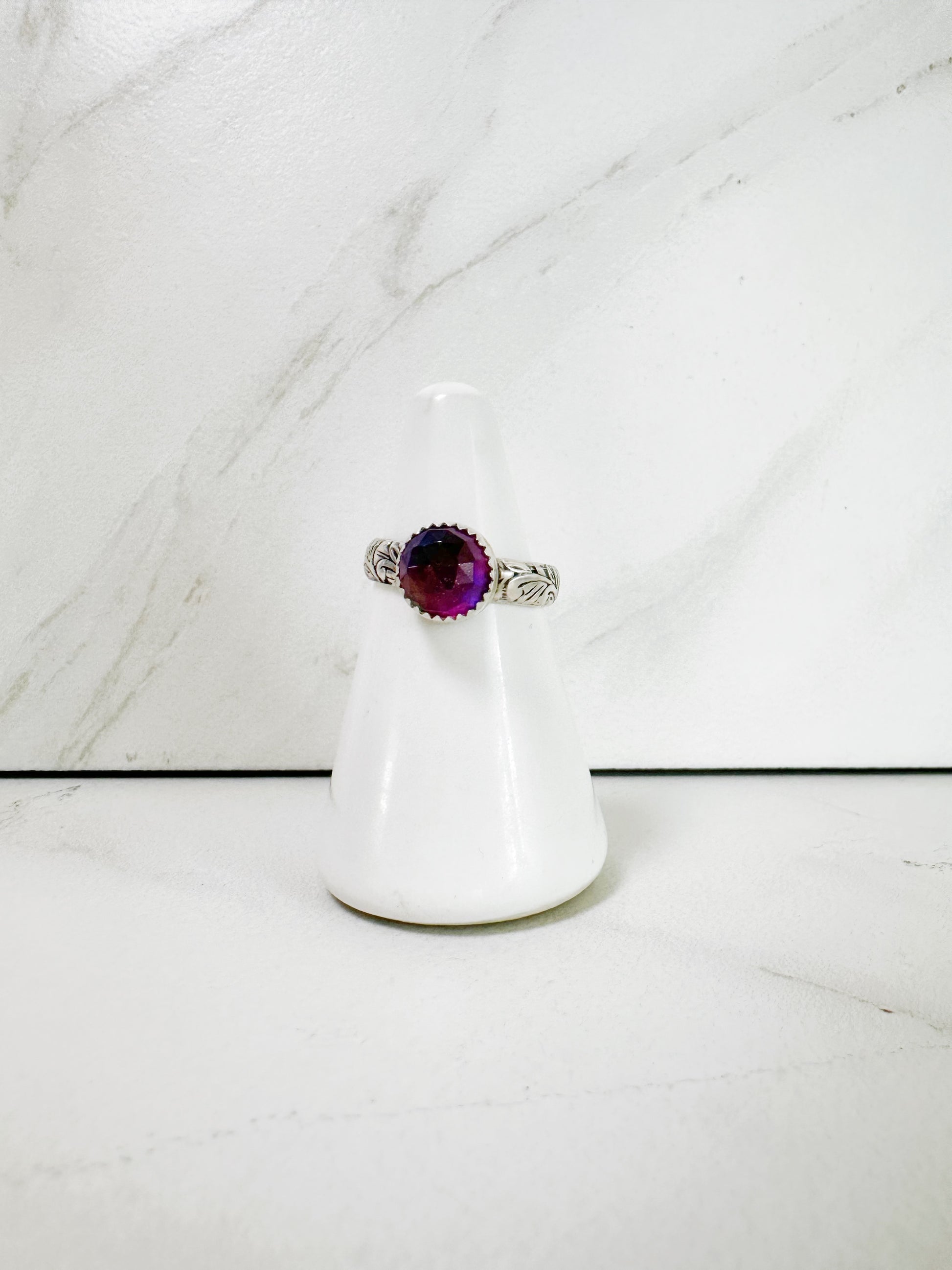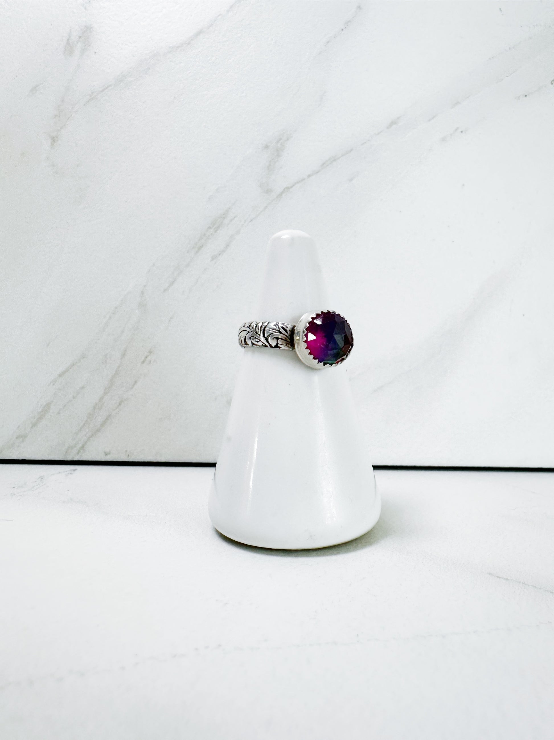 This stunning ring centers a dazzling purple Aurora opal—a lab‑grown gemstone engineered to mimic the vibrant iridescence of natural opals—nestled within a finely crafted sterling silver filigree band. The gem shifts in color as it catches the light, framed by a vintage-inspired openwork setting.