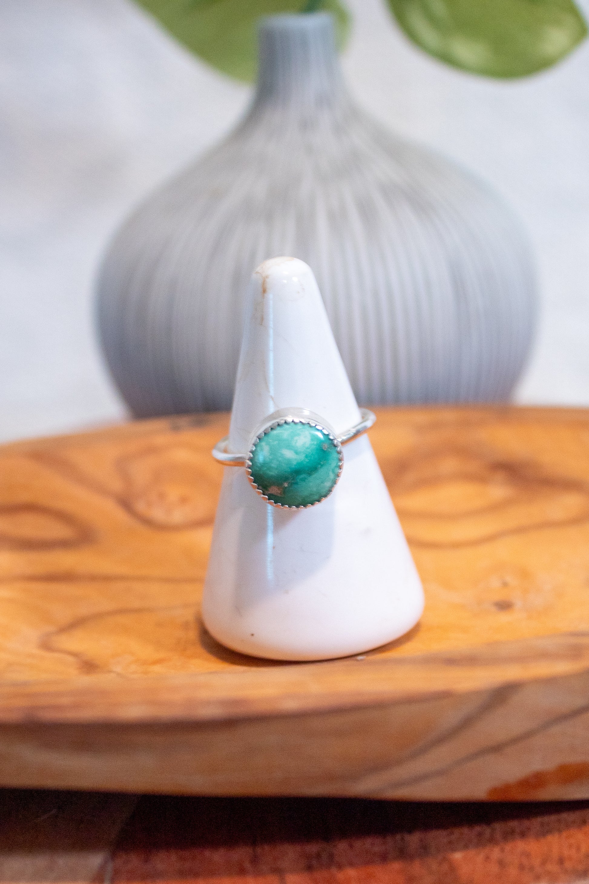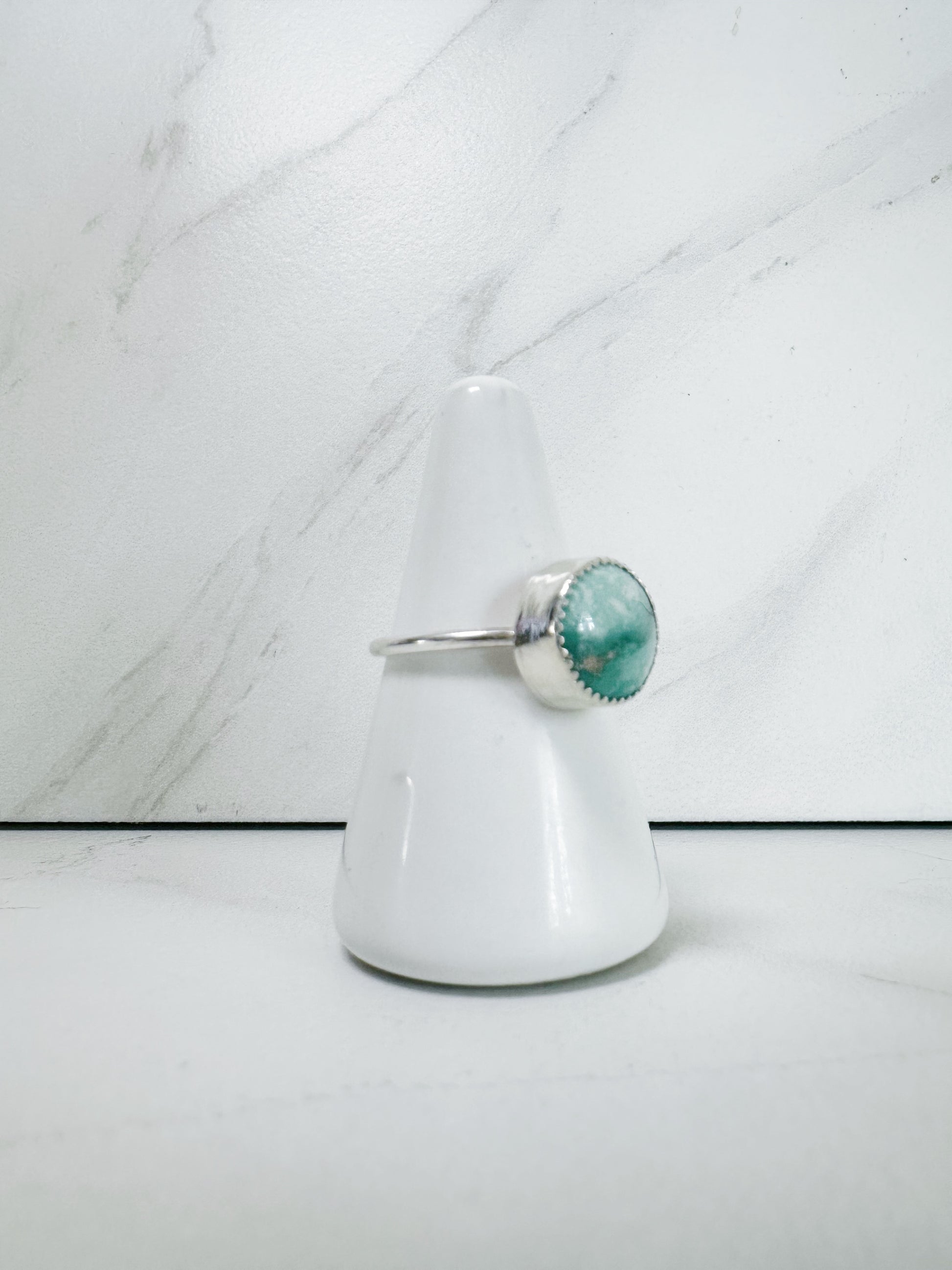 This elegant ring features a classic round turquoise cabochon nestled in a simple sterling silver bezel and mounted on a slim polished band. The clean silhouette and vibrant blue-green tones offer a refined, wearable nod to Southwest-inspired design—perfect for daily wear or stacking with other artisan rings.