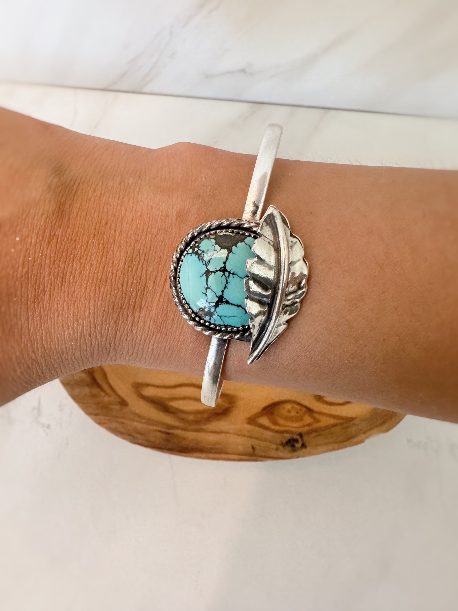 Genuine turquoise cuff bracelet embellished with a hand-crafted sterling silver leaf. Size small.